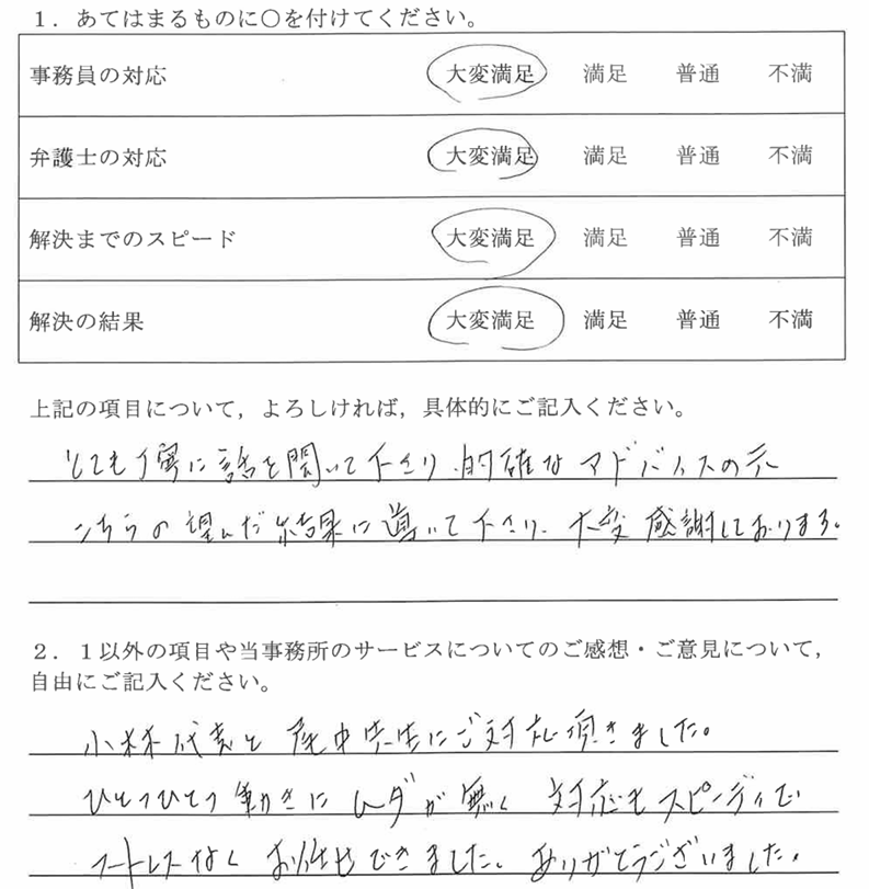 とても丁寧に話を聞いて下さり、的確なアドバイスの元こちらの望んだ結果に導いて下さり、大変感謝しております。小林代表と尾中先生にご対応頂きました。ひとつひとつ動きにムダが無く対応もスピーディでストレスなくお任せできました。ありがとうございました。